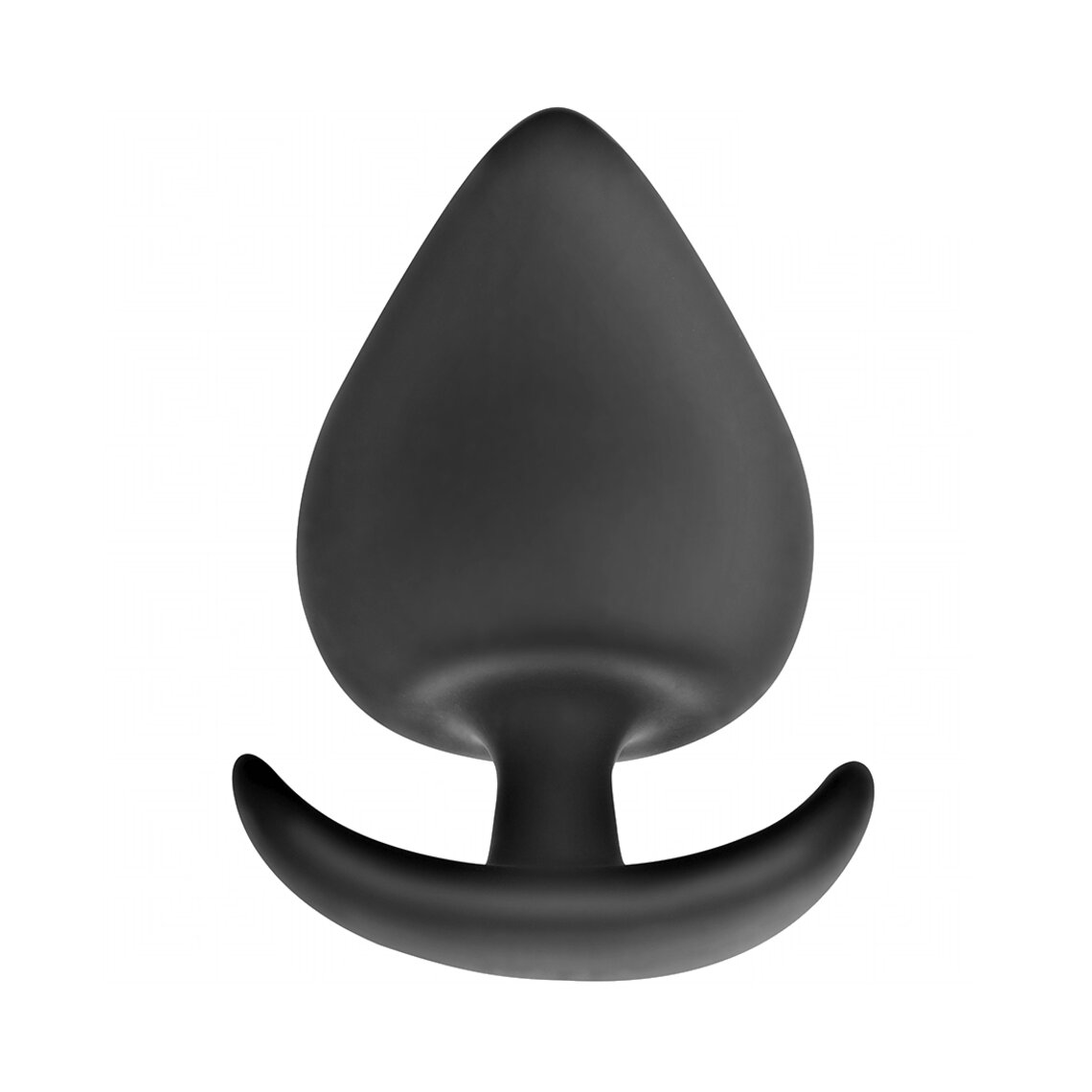 Plug anal de silicone médio com formato de espadas e base em gancho. Comprimento inserível: 6,2 cm, diâmetro: 3,4 cm.