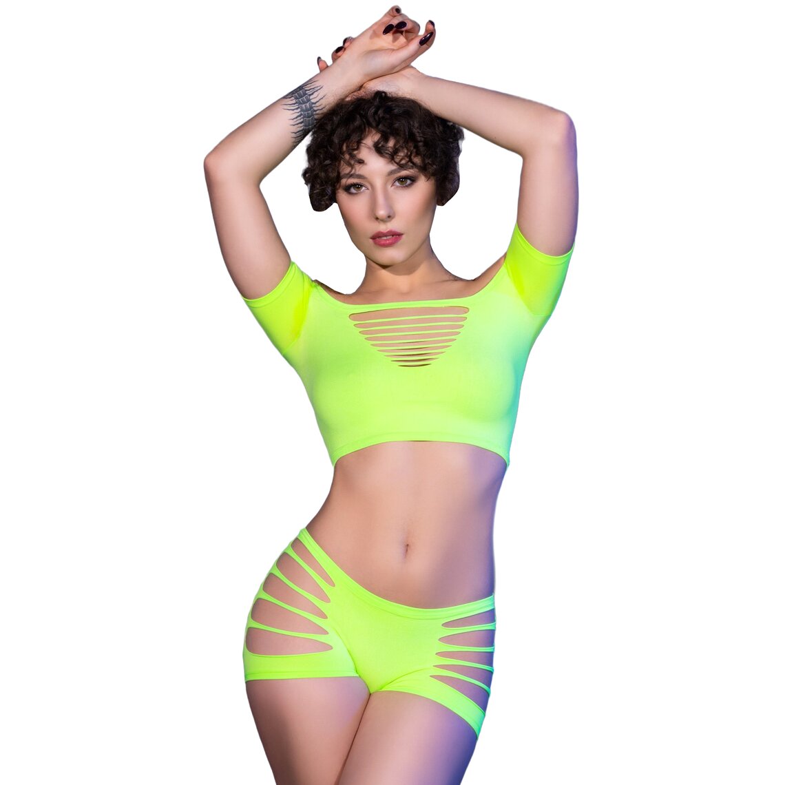Conjunto erótico feminino: top e shorts na cor verde néon. Feito em tecido elástico.
