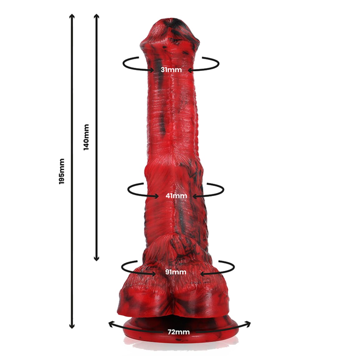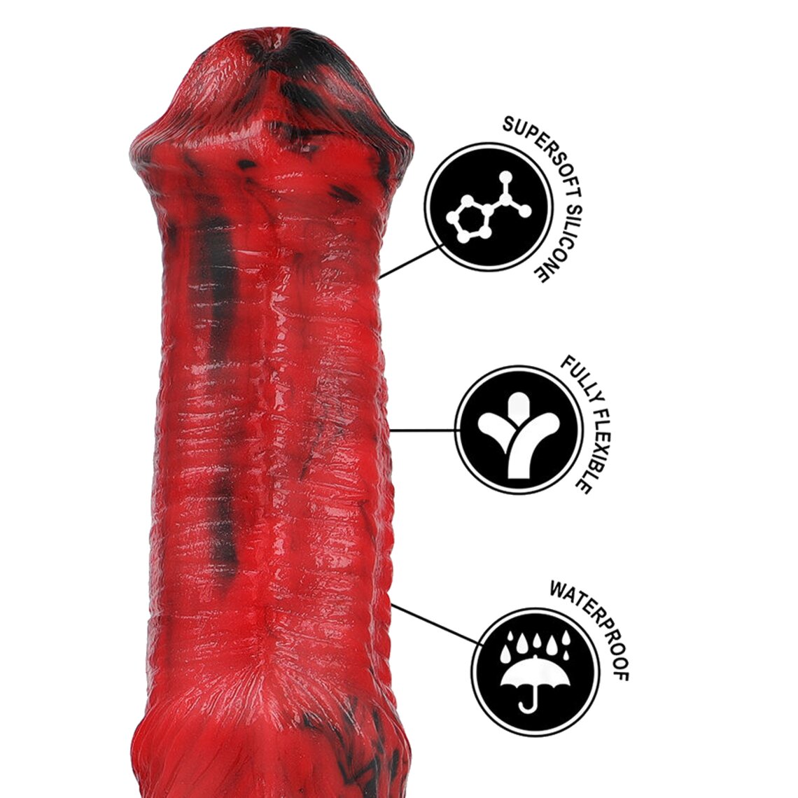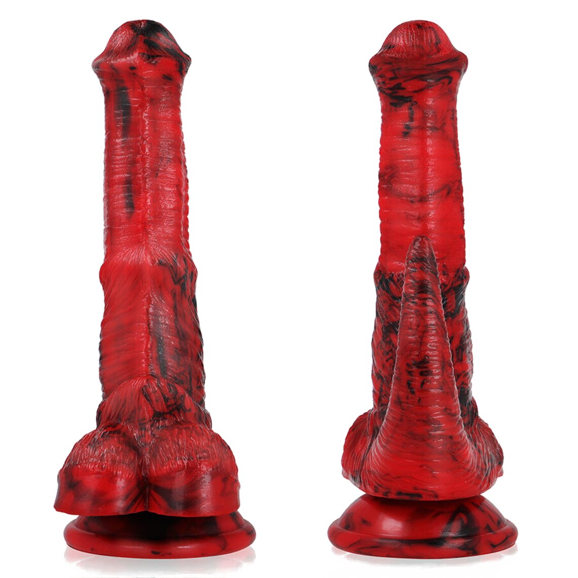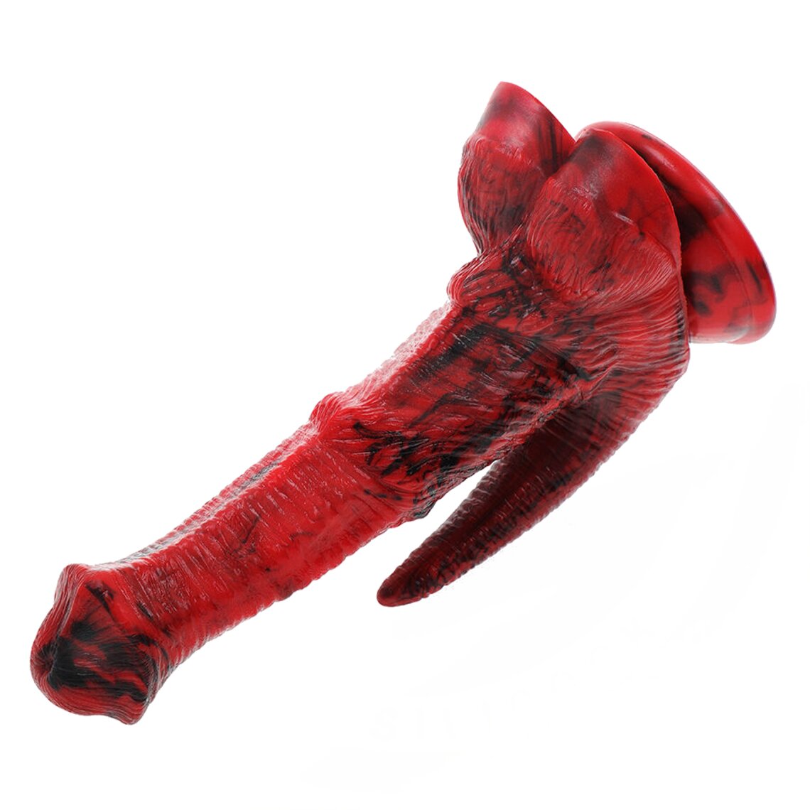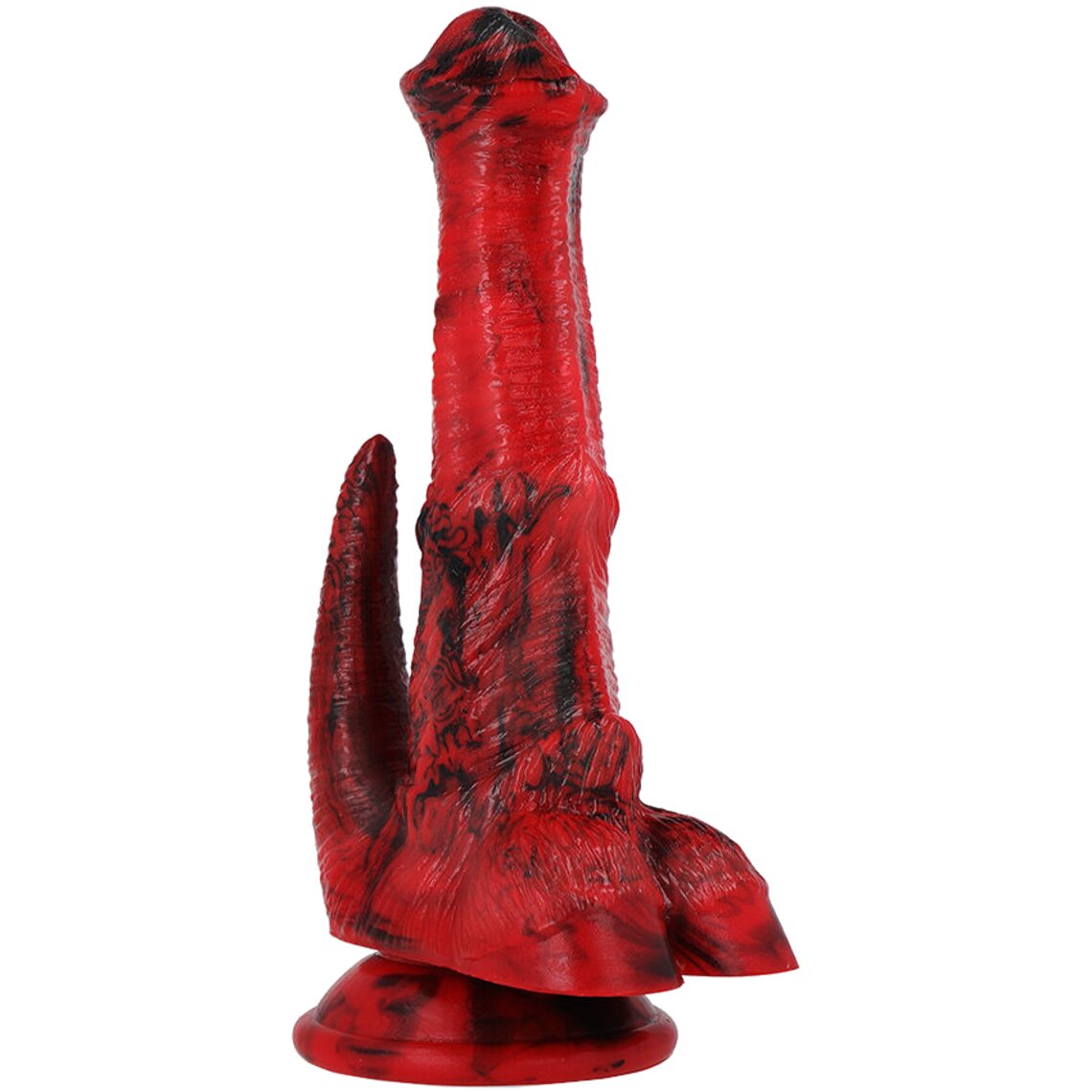 Dildo de fantasia inspirado no pênis de um dragão mitológico. 19,5 cm de altura. Vermelho e preto.
