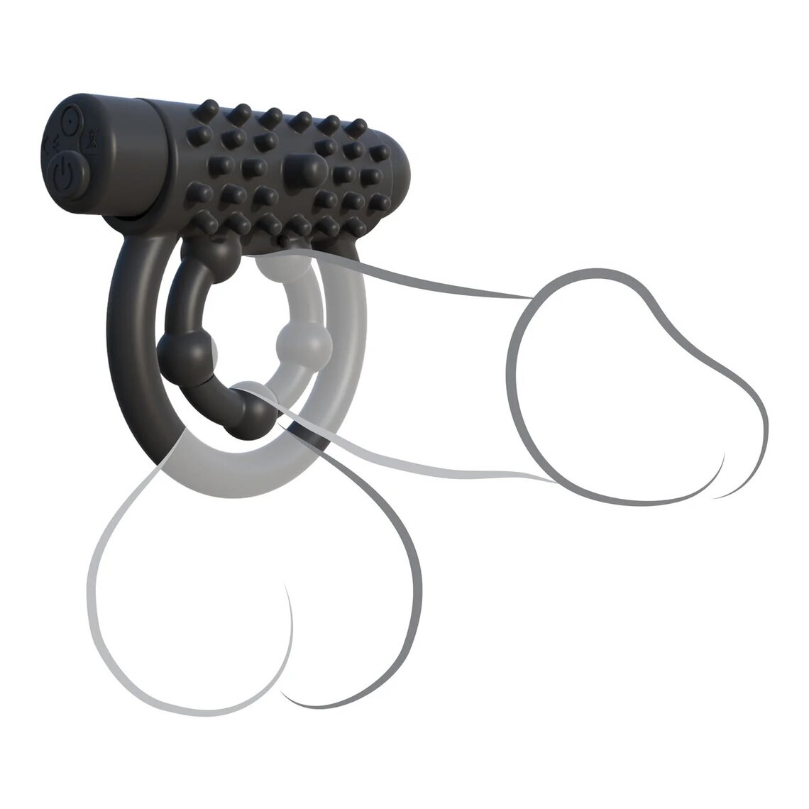 Anel vibratório duplo: um na base do pénis e outro por baixo dos testículos.