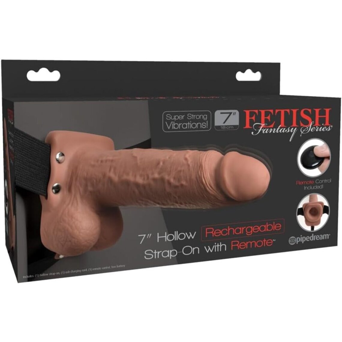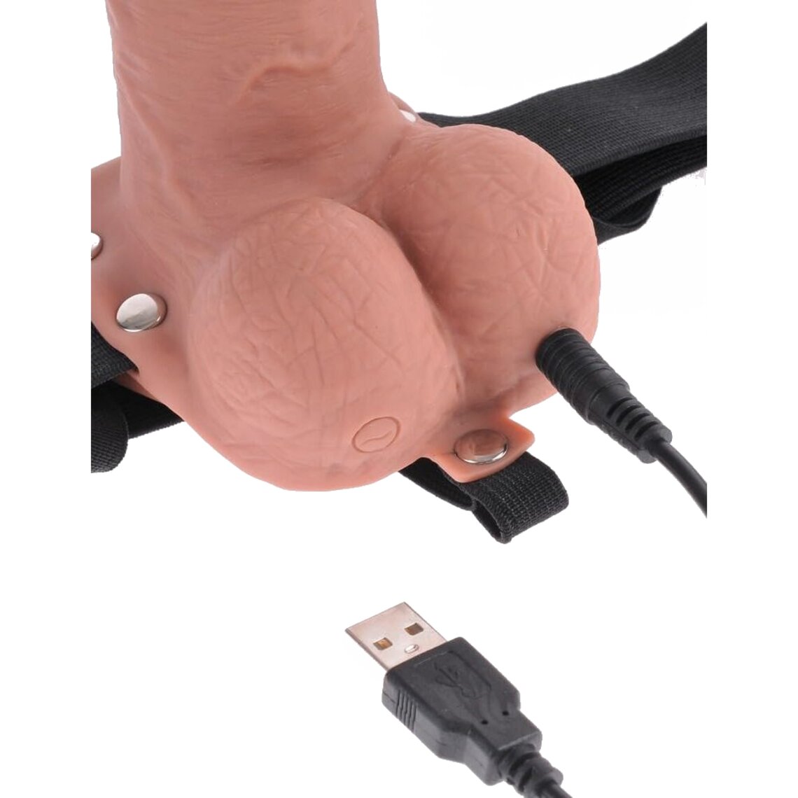Arnês sexual com pênis vibratório oco de 20 cm de comprimento e 5 cm de diâmetro.