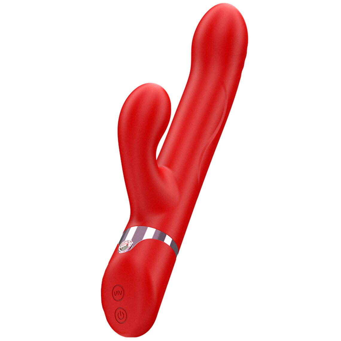 Vibrador multifuncional para mulher que combina rotação, oscilação e estimulação simultânea.
