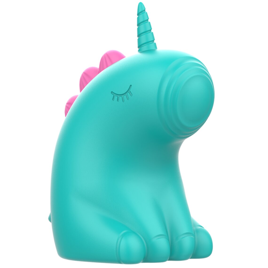 Vibrador divertido em forma de unicórnio turquesa. Estimula o clitóris com efeito de pulsação.