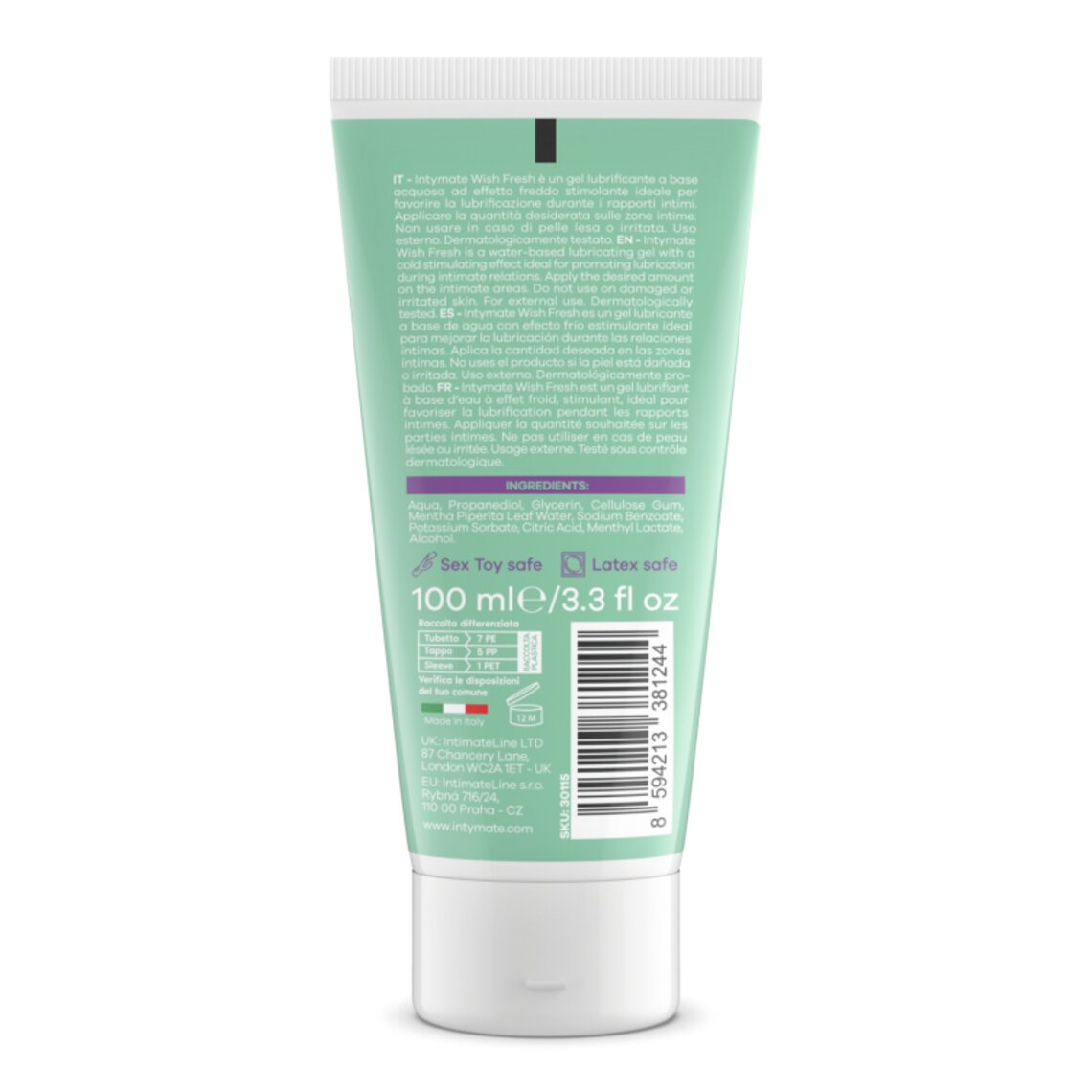 Intymate Wish Fresh é um lubrificante à base de água com efeito frio. Formato 100ml. Estimula, lubrifica e melhora os orgasmos. Compatível com látex.