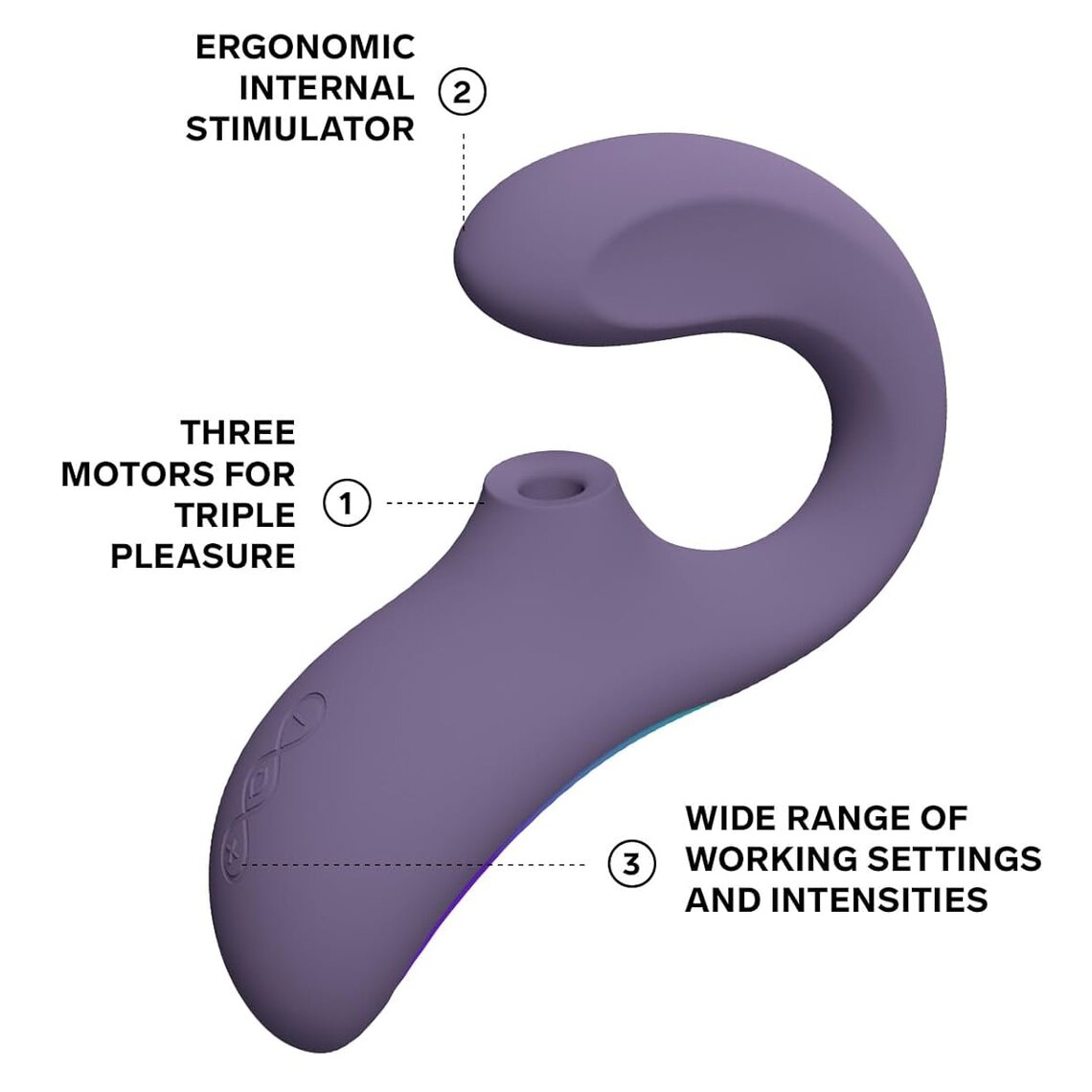 Com oito modos de prazer, três potentes motores e um design aprimorado, ENIGMA Wave™ é o dispositivo ideal para quem busca uma estimulação tripla incomparável. Feito com silicone biocompatível de alta qualidade, oferece uma estimulação exclusiva do clitóris através da tecnologia SenSonic™ e uma massagem espetacular do ponto G graças à WaveMotion™. O primeiro motor é responsável pela estimulação interna com ondas, o segundo pelas vibrações intensas e o terceiro, com SenSonic™, emite pulsos sônicos que ressoam profundamente na estrutura interna do clitóris para uma sensação totalmente nova.