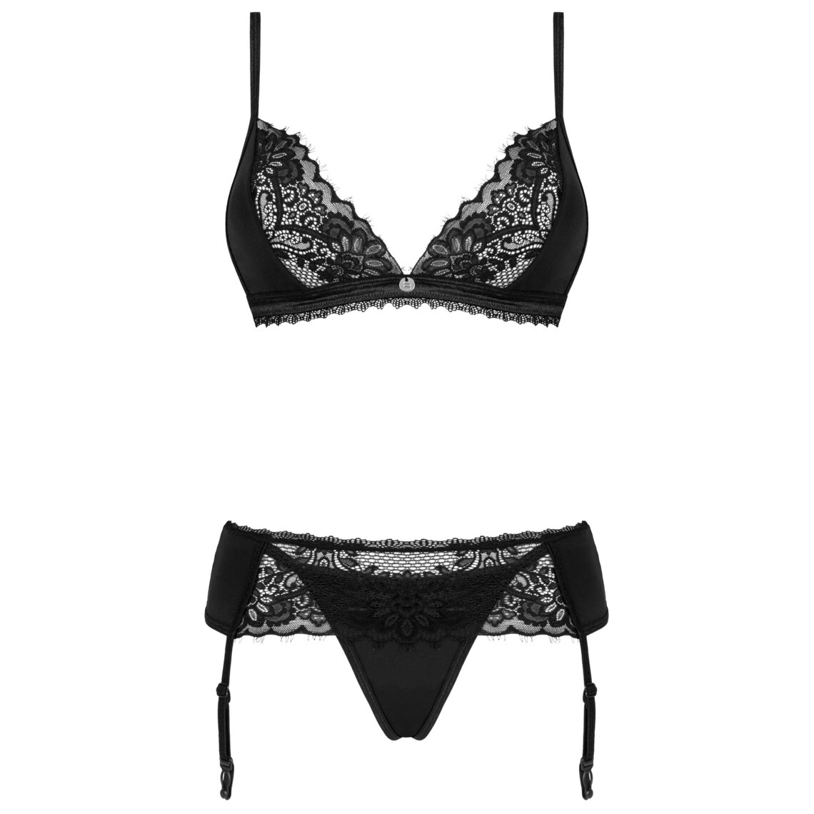 Conjunto de lingerie muito sensual de 3 peças : Sutiã, cinta-liga e tanga. Marca obsessive, cor preto.