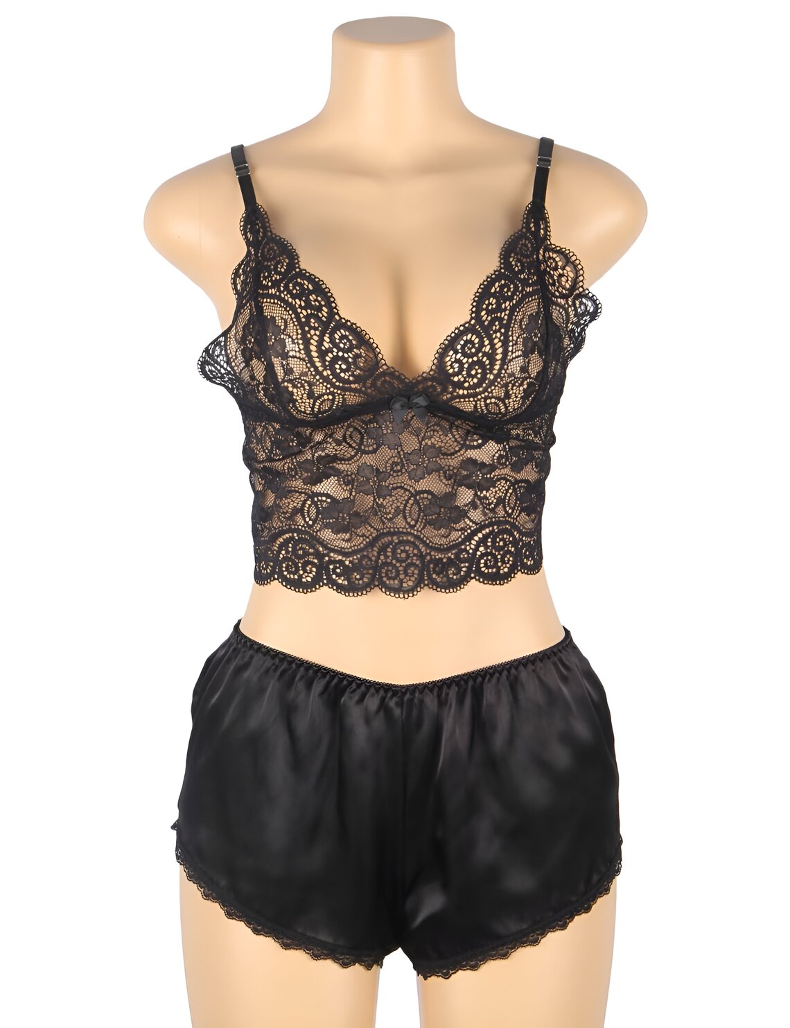 Conjunto lingerie com top de renda, tanga e short de cetim