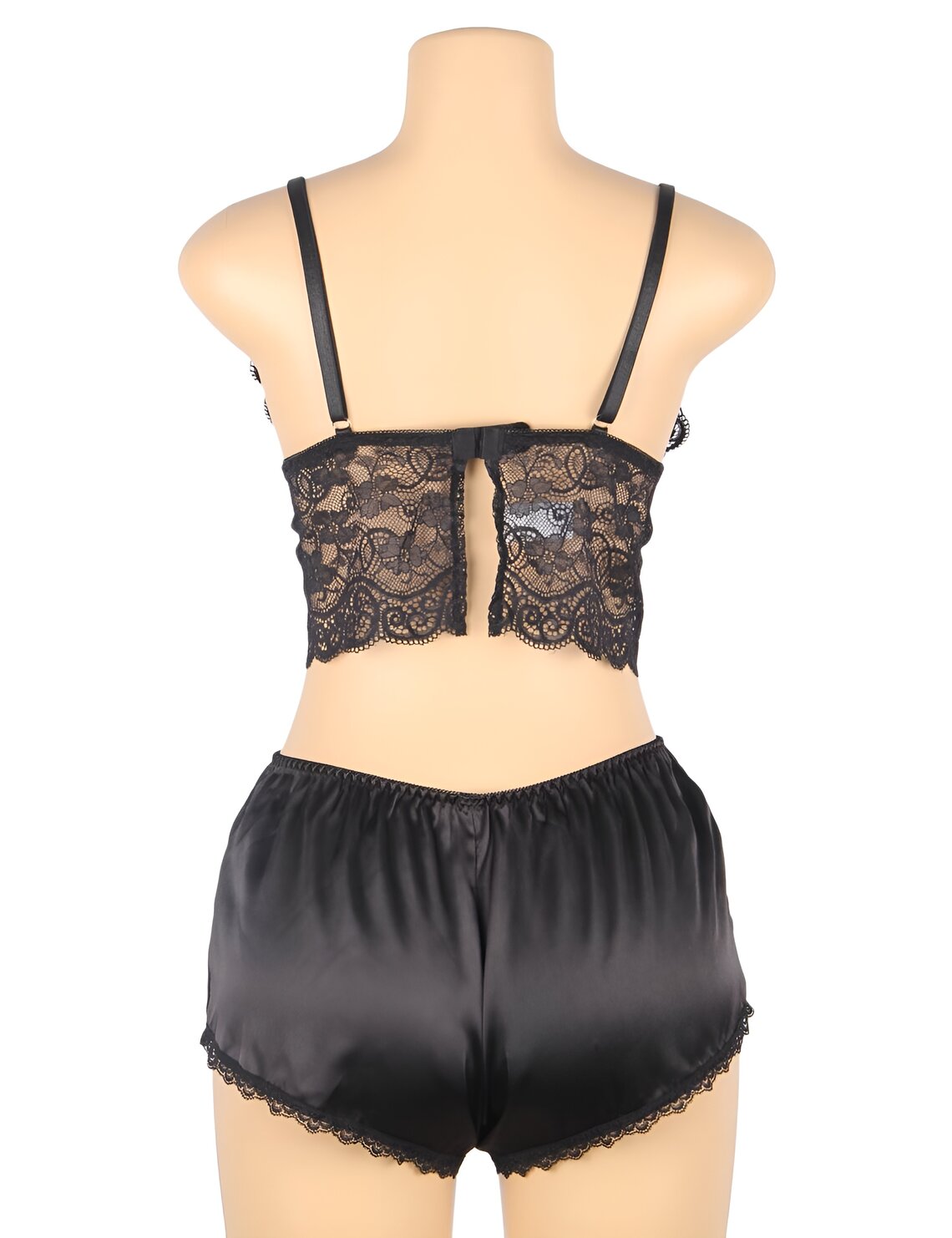 A parte inferior é composta por um tanga a condizer em renda, que mantém o mesmo design elegante e feminino, juntamente com um short em cetim suave que acrescenta fluidez e um contraste sofisticado ao conjunto.