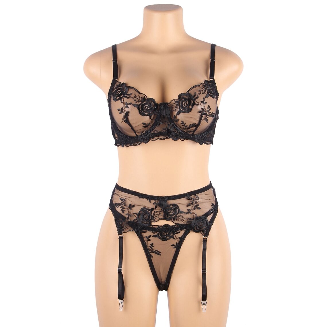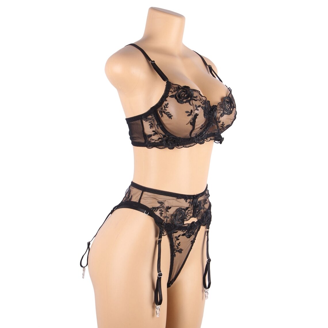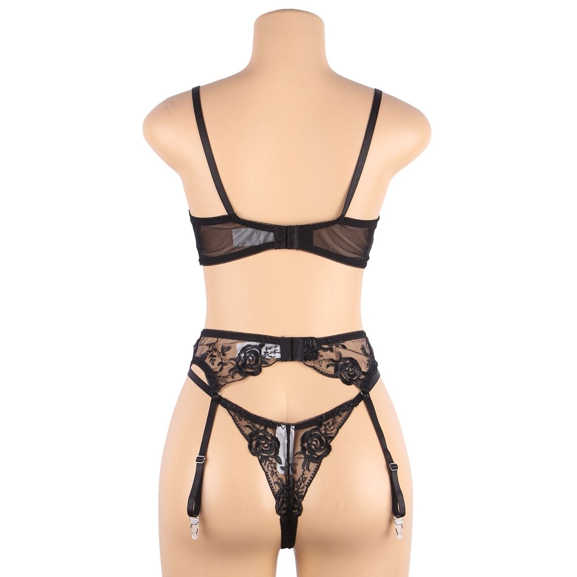 Conjunto de lingerie sexy na cor preta com 3 peças (sutiã, tanga e cinta-liga). Detalhes decorativos em renda floral.