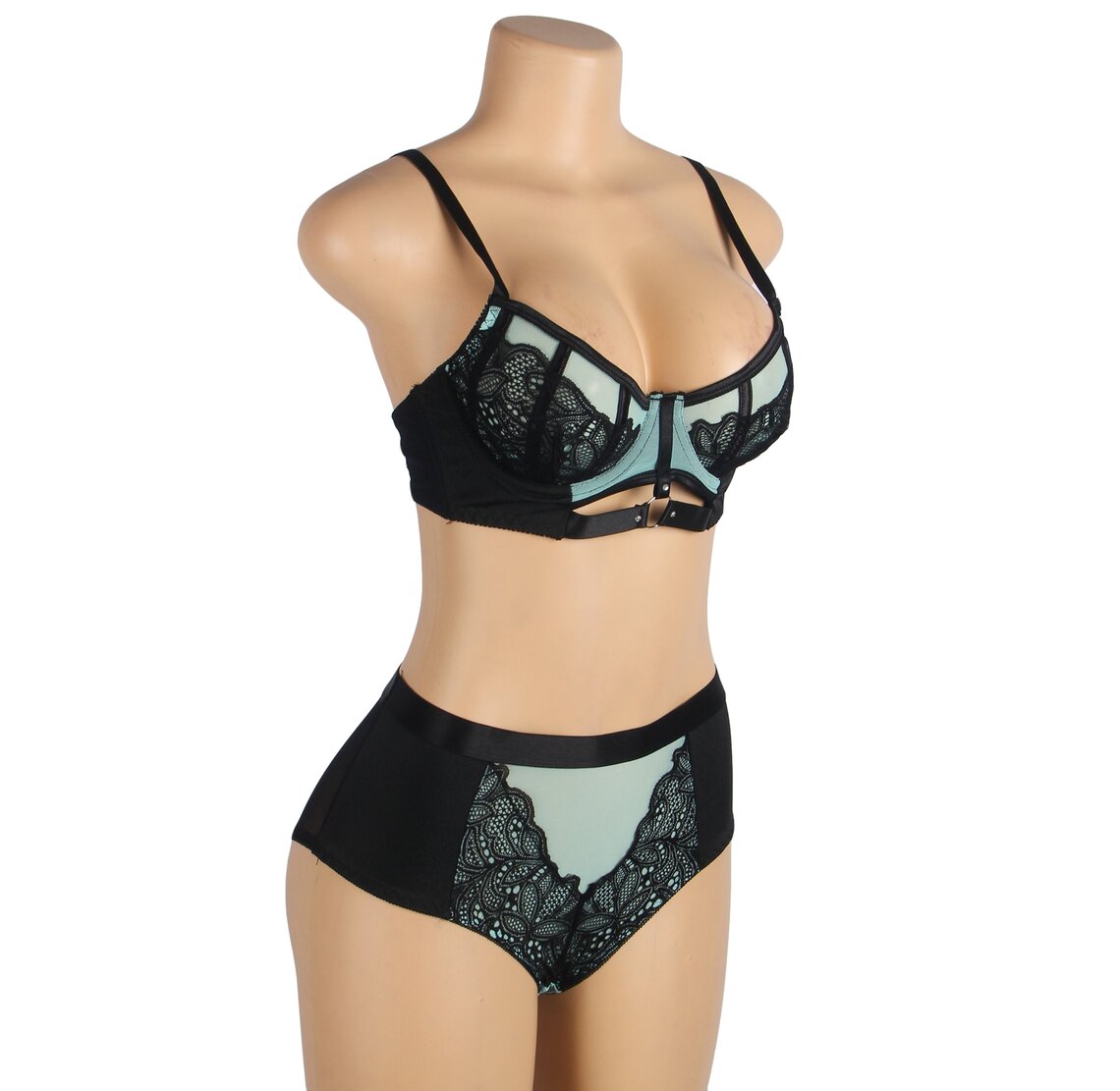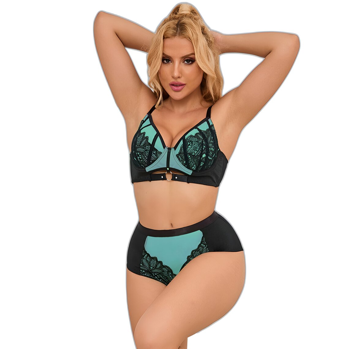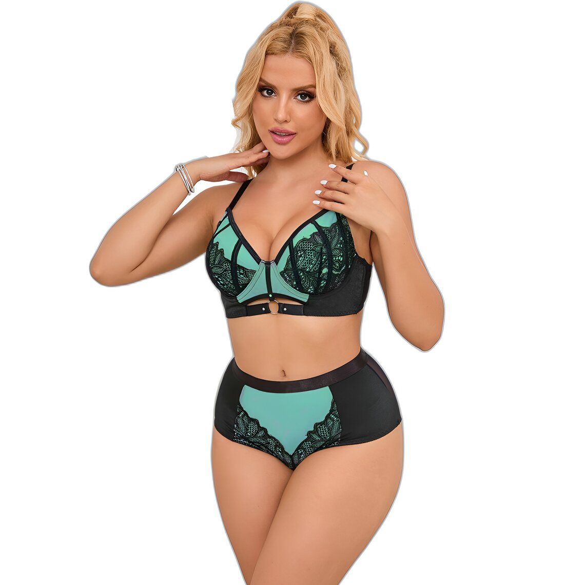 Descubra um equilíbrio perfeito entre sofisticação e sensualidade com este elegante conjunto da SUBBLIME. Concebido para valorizar a silhueta feminina, combina renda delicada e malha translúcida num atraente tom verde com contrastes em preto que lhe conferem um ar moderno e refinado.