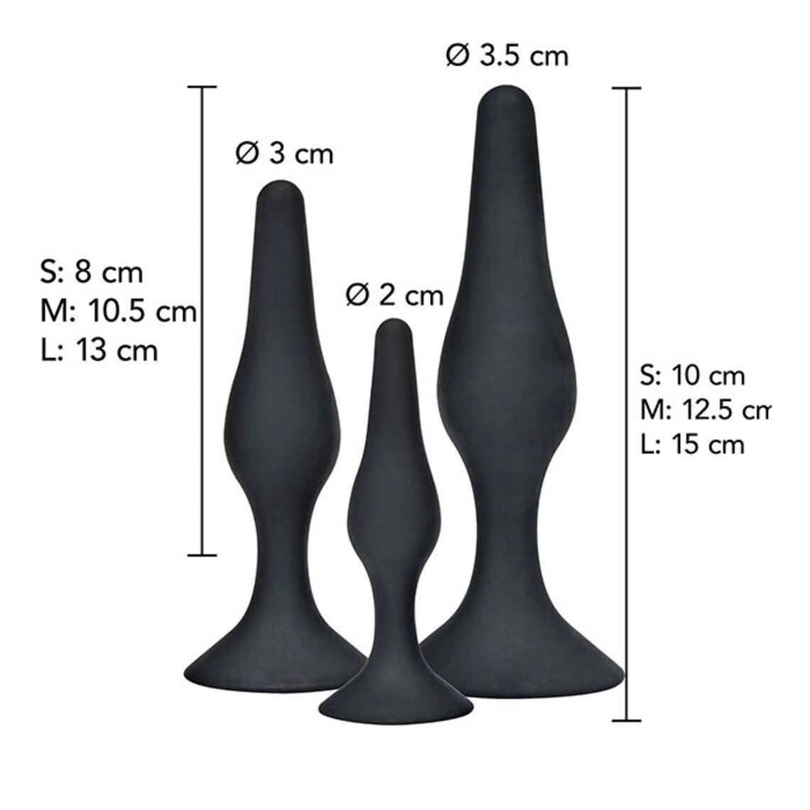 Cada plug é feito de silicone sedoso de grau médico, totalmente seguro para o corpo, hipoalergênico e fácil de limpar. Os três tamanhos incluídos no kit permitem uma jornada gradual e personalizada, ideal para quem busca experimentar desde o nível iniciante até o mais avançado. Sua base larga garante uma experiência segura e confortável, seja sozinho ou acompanhado.
